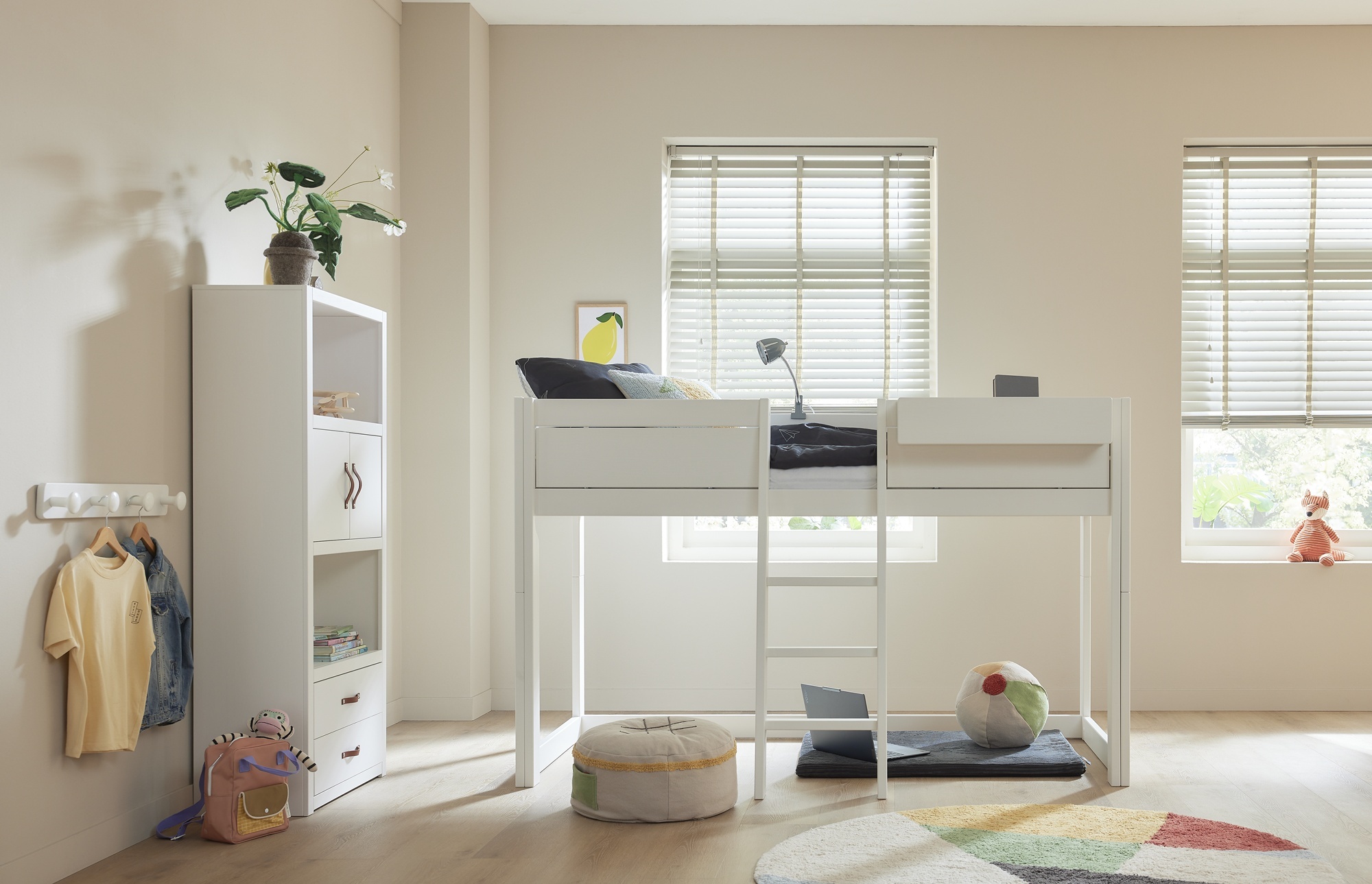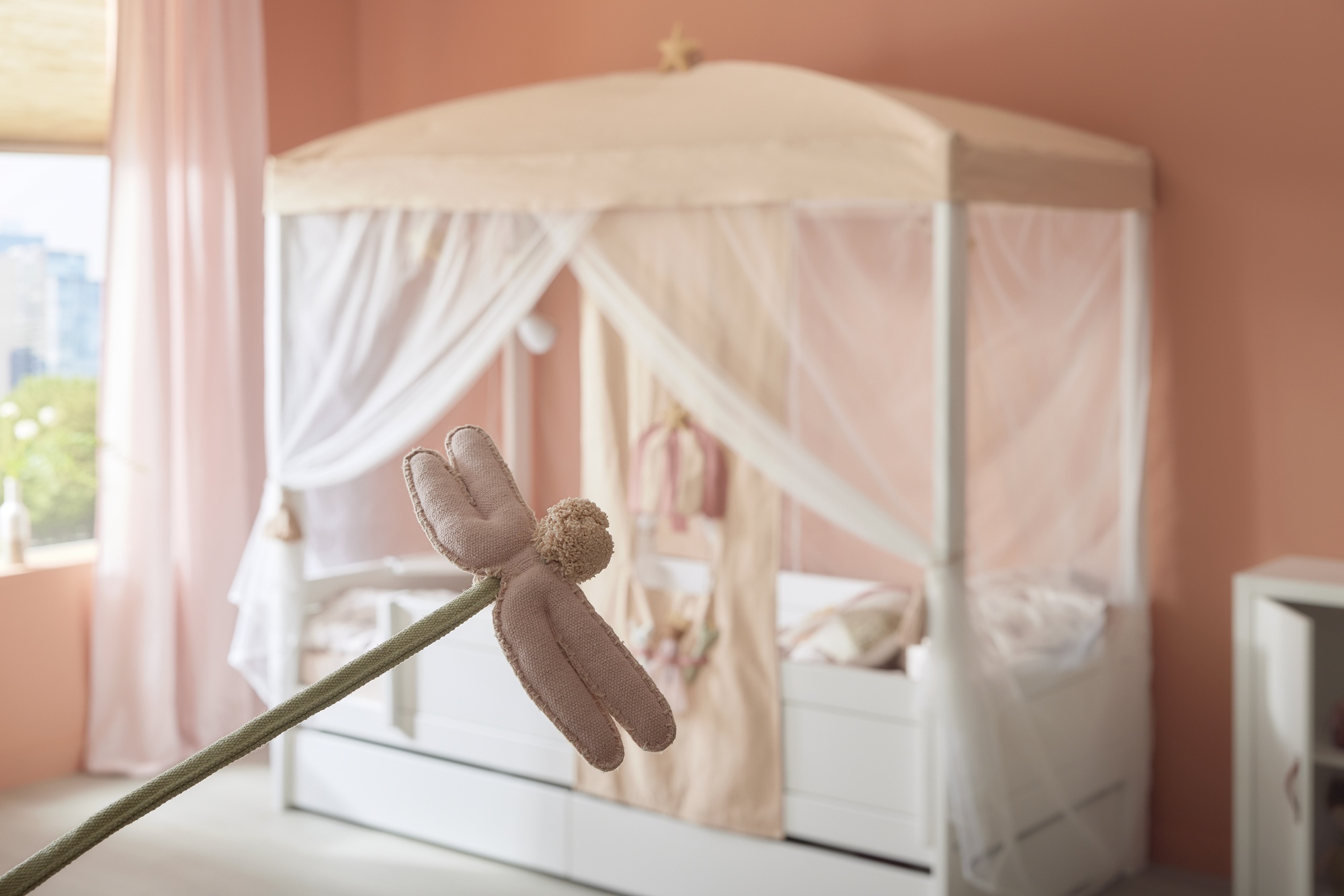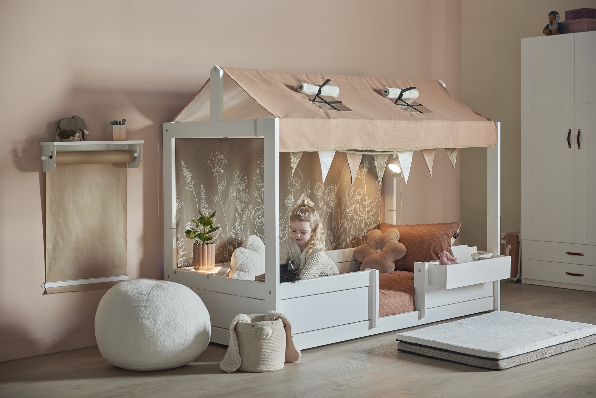 Discover the Lifetime Kidsrooms 4-in-1 Bed with Roof – the ultimate versatile children's bed that grows with your child from toddler to school age. This Danish-designed house bed features a charming fabric roof frame (soft canopy included or optional), turning bedtime into a magical playhouse while offering four adaptable configurations in one sturdy frame. Crafted from sustainable FSC-certified Nordic pine wood with safe, non-toxic white lacquer, it's TÜV SÜD certified for maximum safety (EN 747 compliant). Perfect for Hong Kong families in compact apartments, this bed starts as a low floor bed for independent toddlers, evolves into a mid-sleeper with play/storage space underneath, becomes a classic single bed with roof for cozy dreams, and simplifies as needed – all without buying new furniture. Mattress size 90x200 cm (not included), dimensions approx. H128–179 x L207 x W102–124 cm. Ideal for promoting independence, imagination, and long-term value in modern HK homes. Shop now at Tavolo Kids Living for premium, eco-friendly kids furniture that lasts a lifetime!