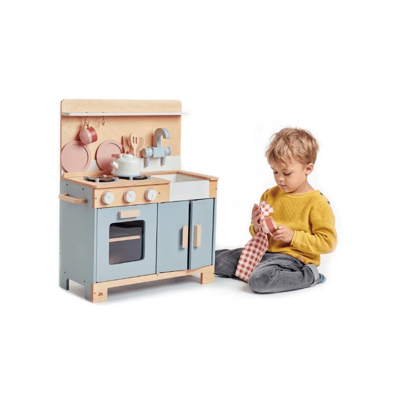 Included in this set are a solid wood white kettle, 2 cups and saucers, 3 utensils and utensil holder, a printed gingham tea towel, a soap, a slicing baguette, and an oven tray that can also be used to cover the sink area and provide an extra work surface for pretend play.