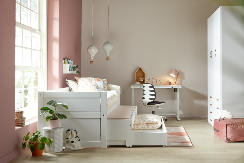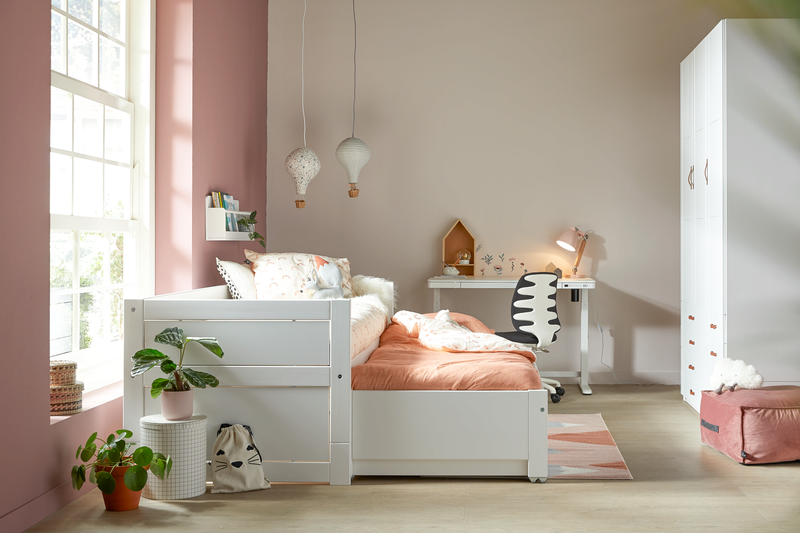 LIFETIME Kidsroom's white lacquered children's beds are made from solid pine wood without knots, to avoid typical discolouration through the knots. The surface is treated with a white water-based furniture lacquer, which ensures an easy-to-clean and resistant surface combined with an environmentally conscious choice. In our white lacquered beds, we use MDF for front panels, fillings, doors, and drawer fronts. Due to different materials, slight colour differences may occur.