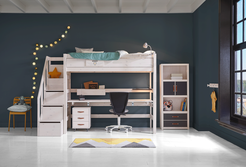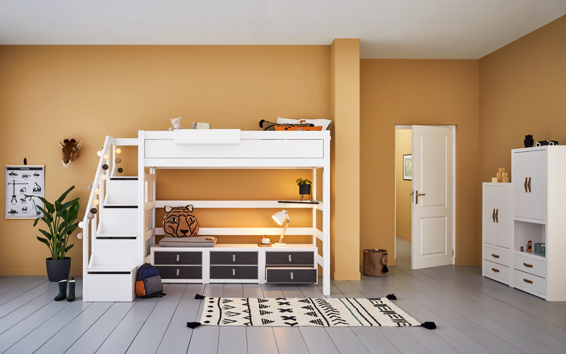 Created to learn. This high-rise sleeper is ready for it. You can place 1 of our stand-alone height adjustable desks below it, or even have a height adjustable full width desktop below the bed. With the slanted ladder it will be more easy to climb up.