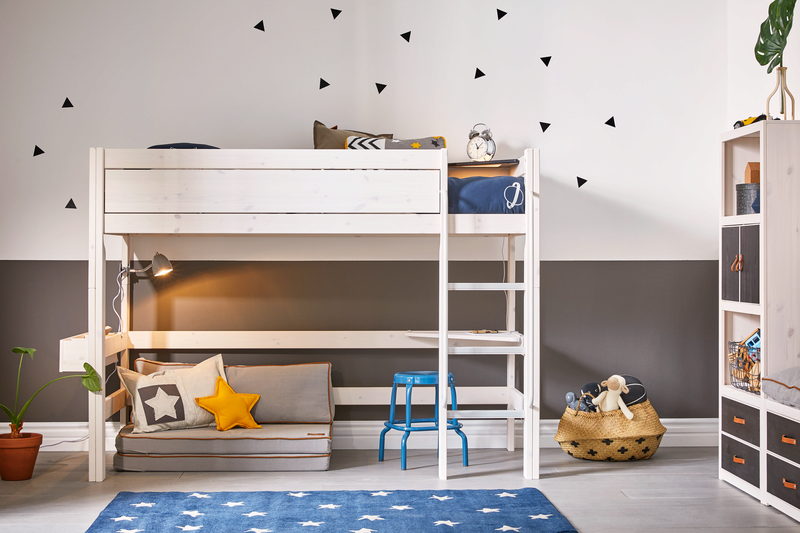 This great low loft bed with slanted ladder, creates a high-functional space in the children's room. With the total height of 152 cm you get the optimal solution, where you still have easy access to the bed on top, but at the same time get much more space below, to be used for storage, play area, small desk or an extra bed.