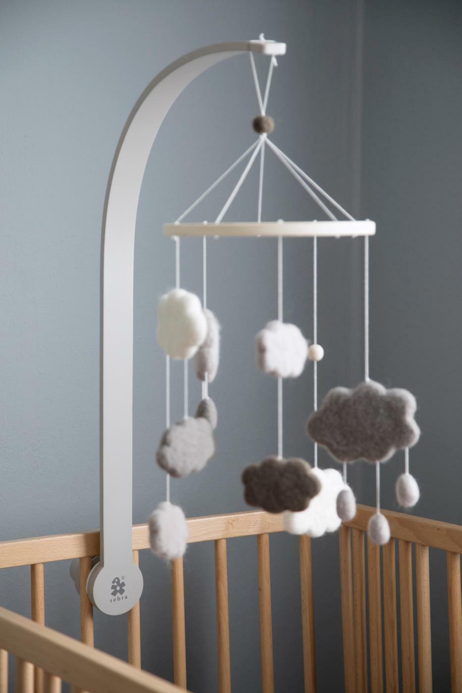 The eight clouds in an array of warm grey shades, some of which have little raindrops, create an almost magical atmosphere above the baby’s bed, crib or changing unit. The parts are connected by a thin string and attached to a wooden ring. Hang the mobile directly from a hook in the ceiling or attach it to a mobile holder or metal frame in the bed’s canopy. The rocking clouds will catch your child’s attention, stimulate the senses and have a calming effect.