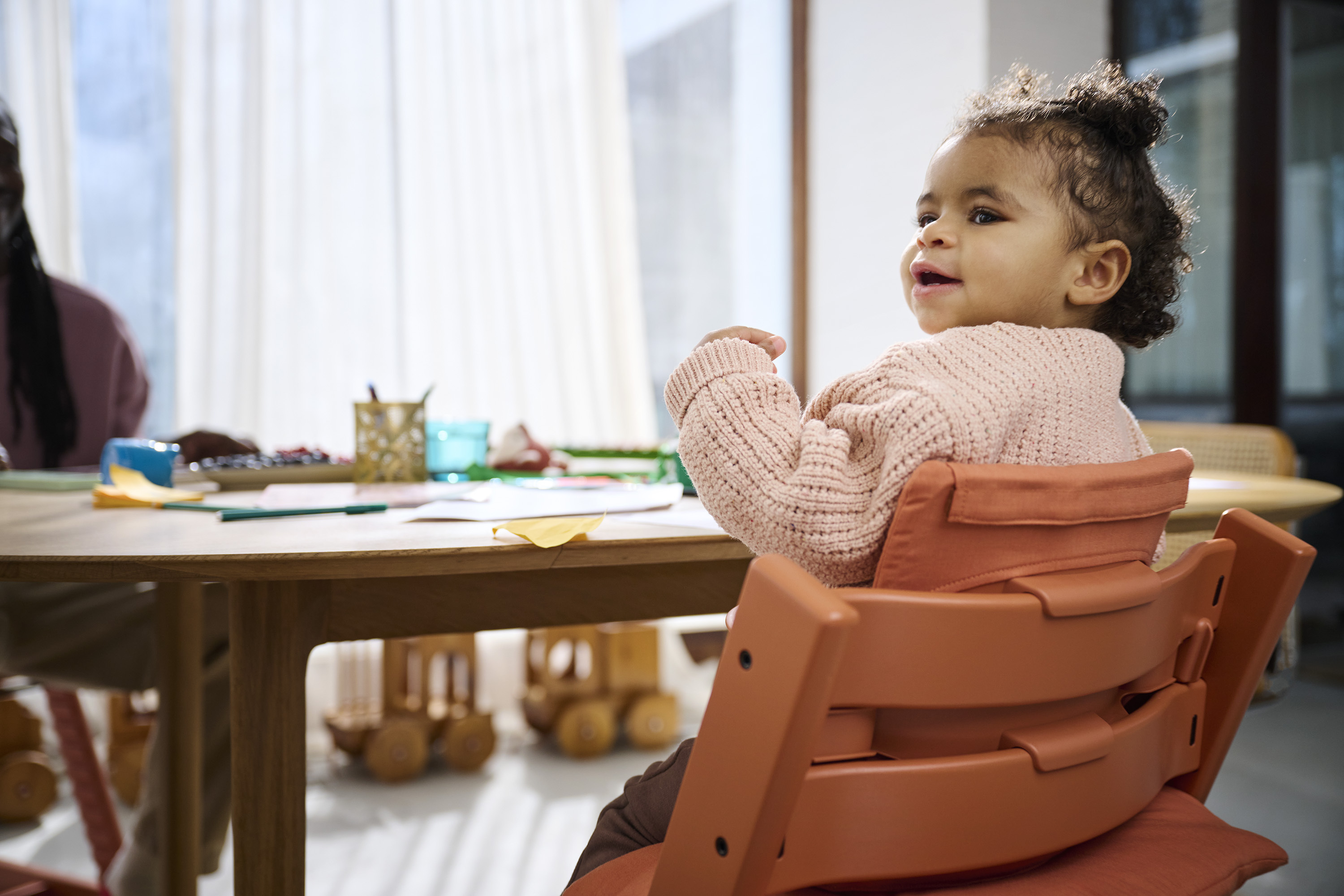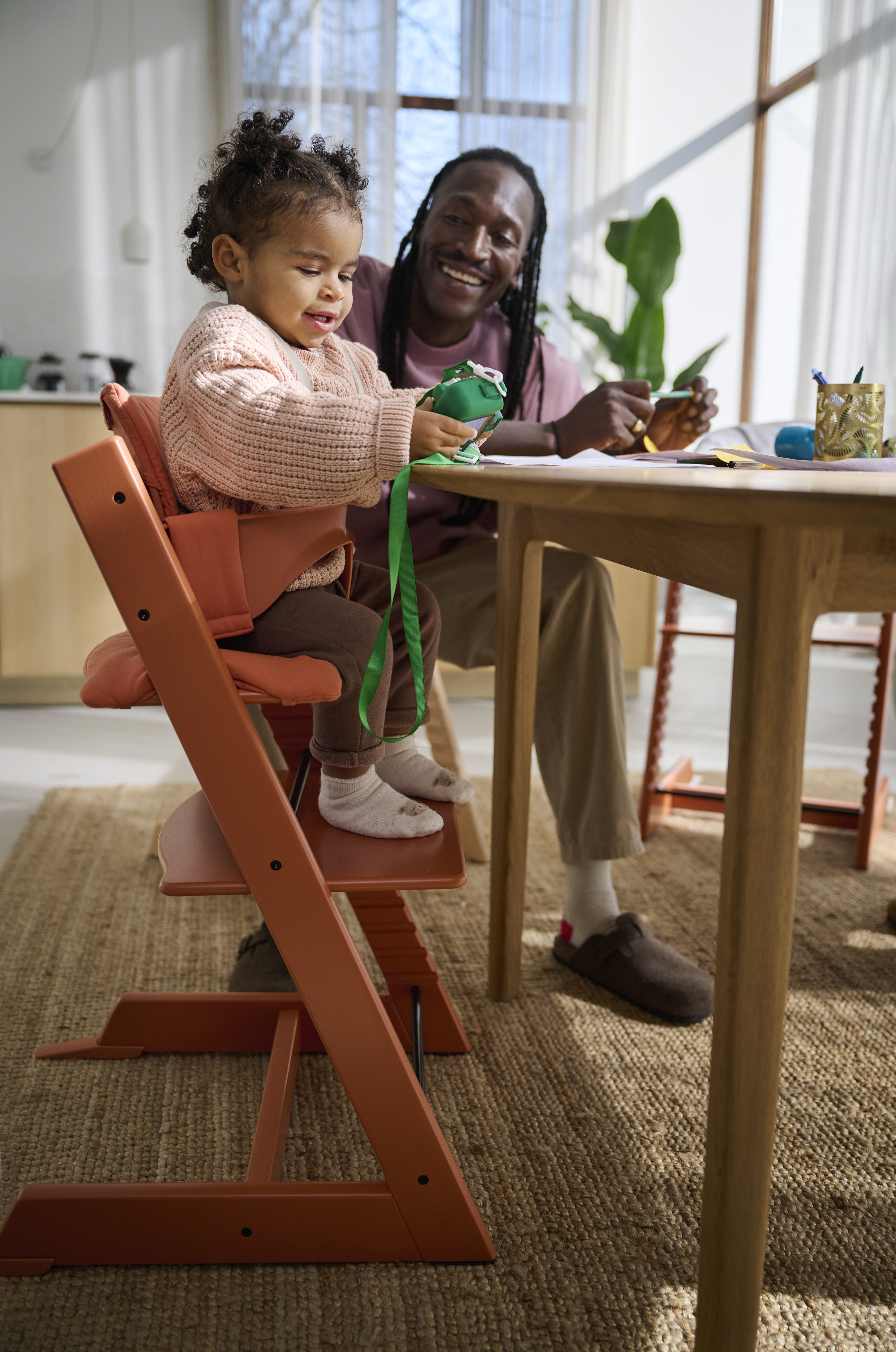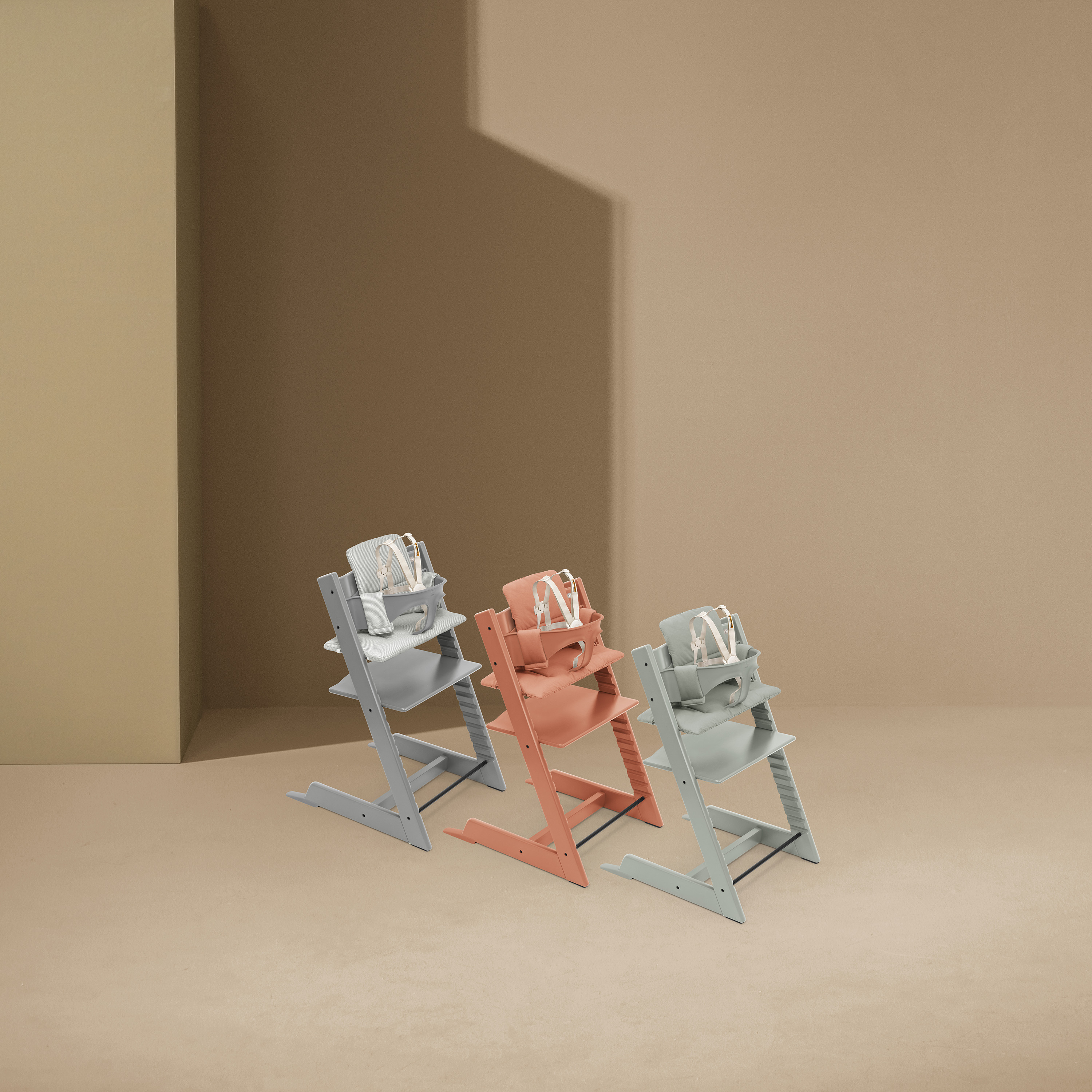 At around six to nine months, your little one will be able to begin sitting up. The Tripp Trapp® Baby Set gently supports your baby to comfortably sit at the table. When your child can confidently climb in and out of their chair on their own, you can remove the Baby Set.
